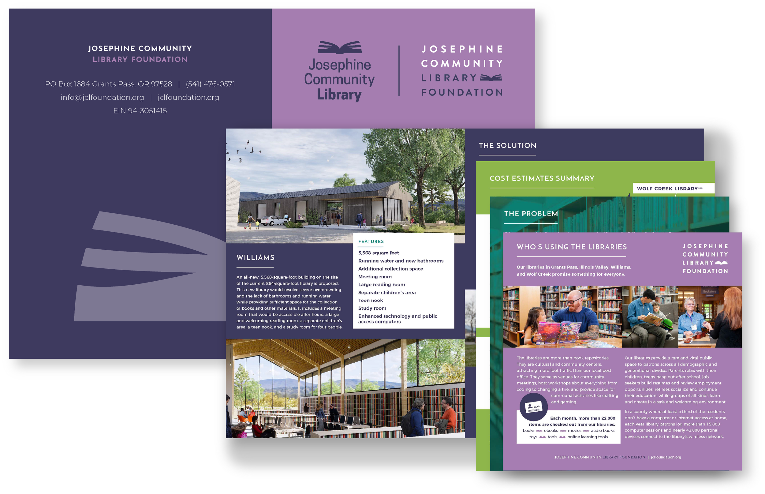 Our brand overhaul for the Josephine Community Library Foundation was grounded in complementary print and digital materials that clearly communicate JCLF’s mission while building confidence among stakeholders, funders and peers.