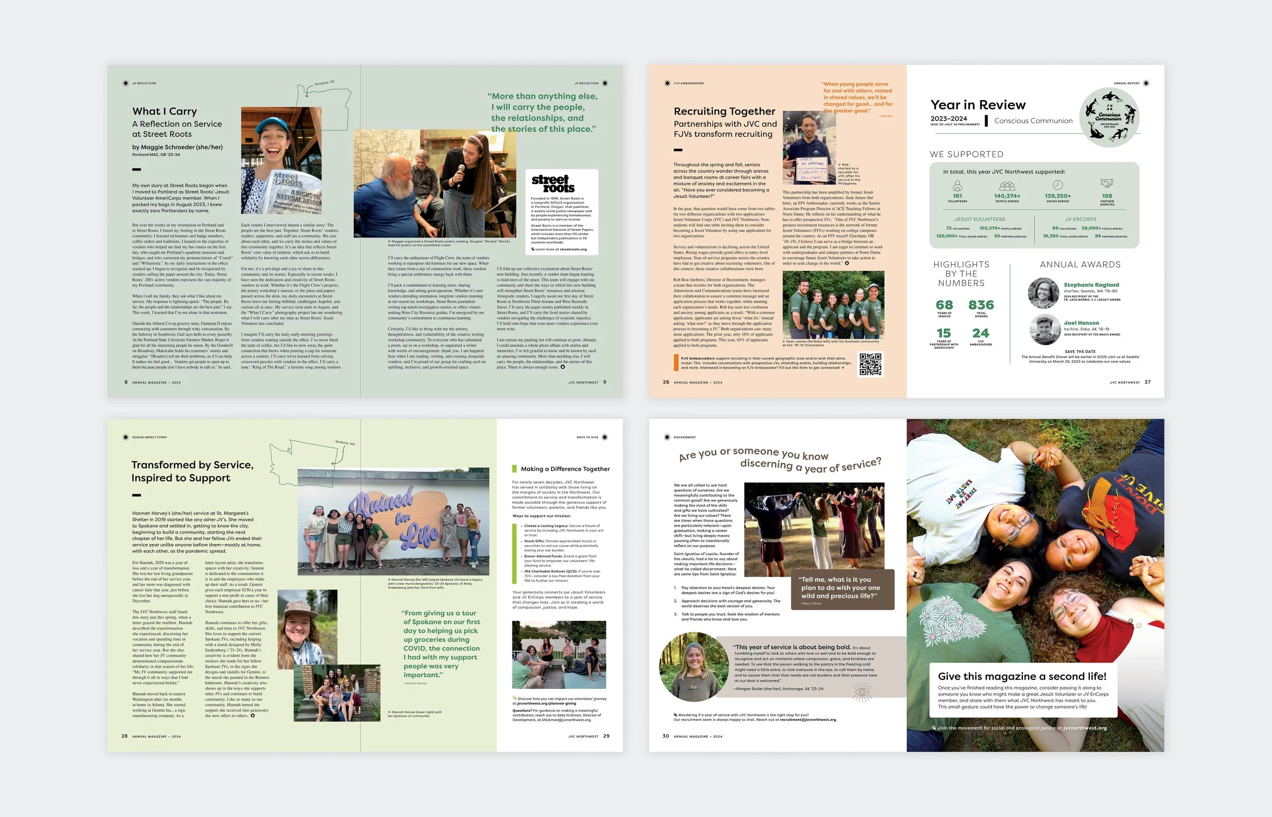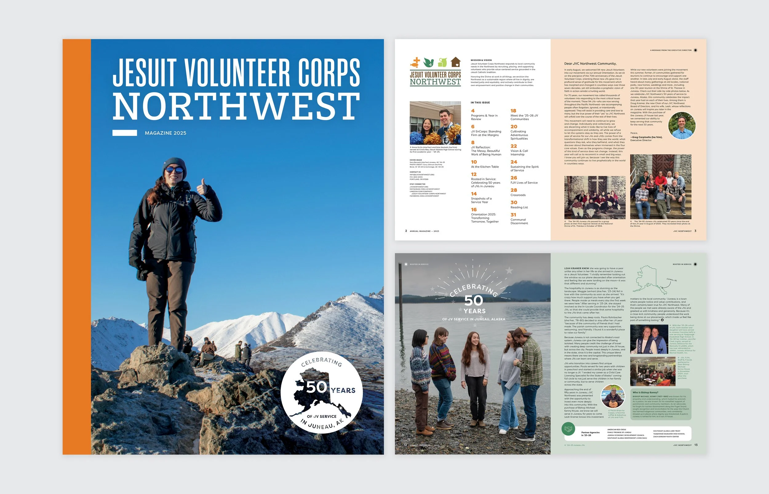 Jesuit Volunteer Corps Northwest asked Sheepscot to redesign its organizational magazine for a new generation. Traditionally printed in black and white on stapled newsprint, the old design fell short both in appearance and content.