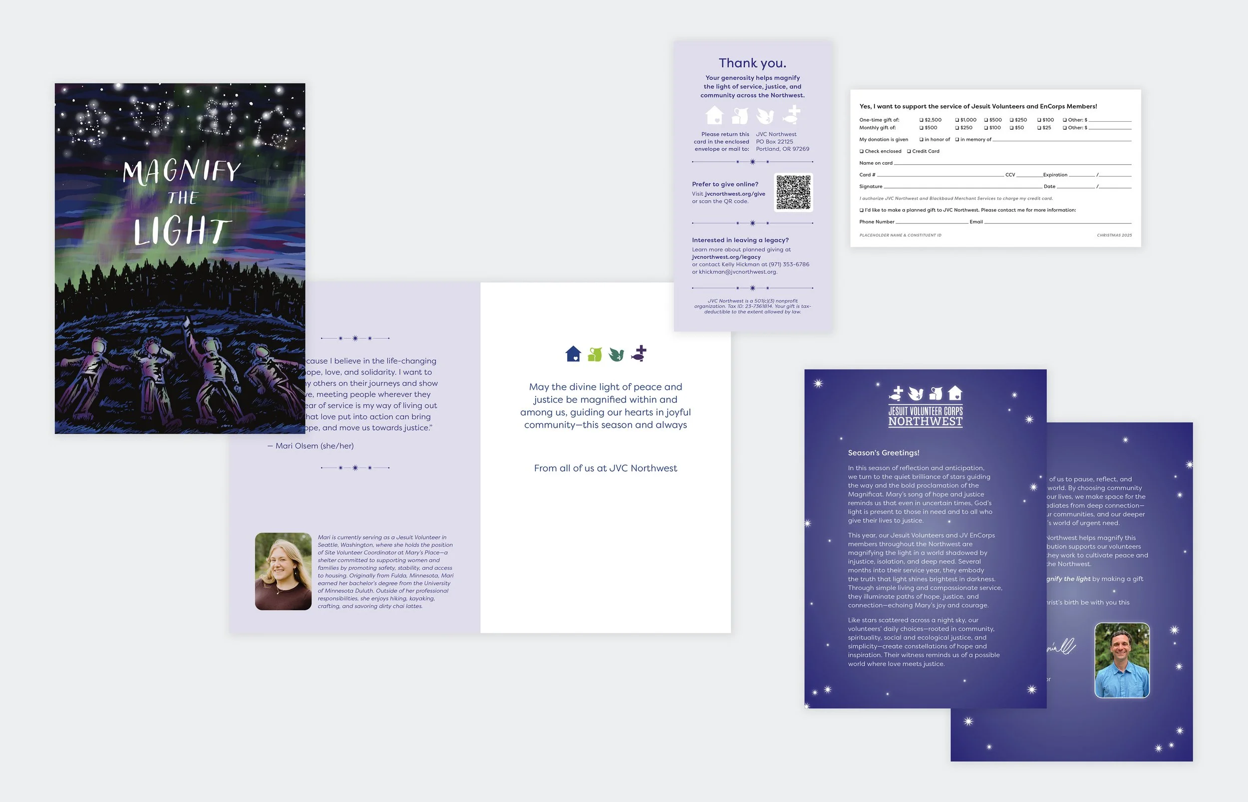 JVC Northwest regularly calls on Sheepscot to develop one-of-a-kind illustrations for use in their fundraising materials. We deliver print-ready files for fundraising appeals, invitations and Christmas cards, as well as digital templates that allow internal staff to build out other materials to match.