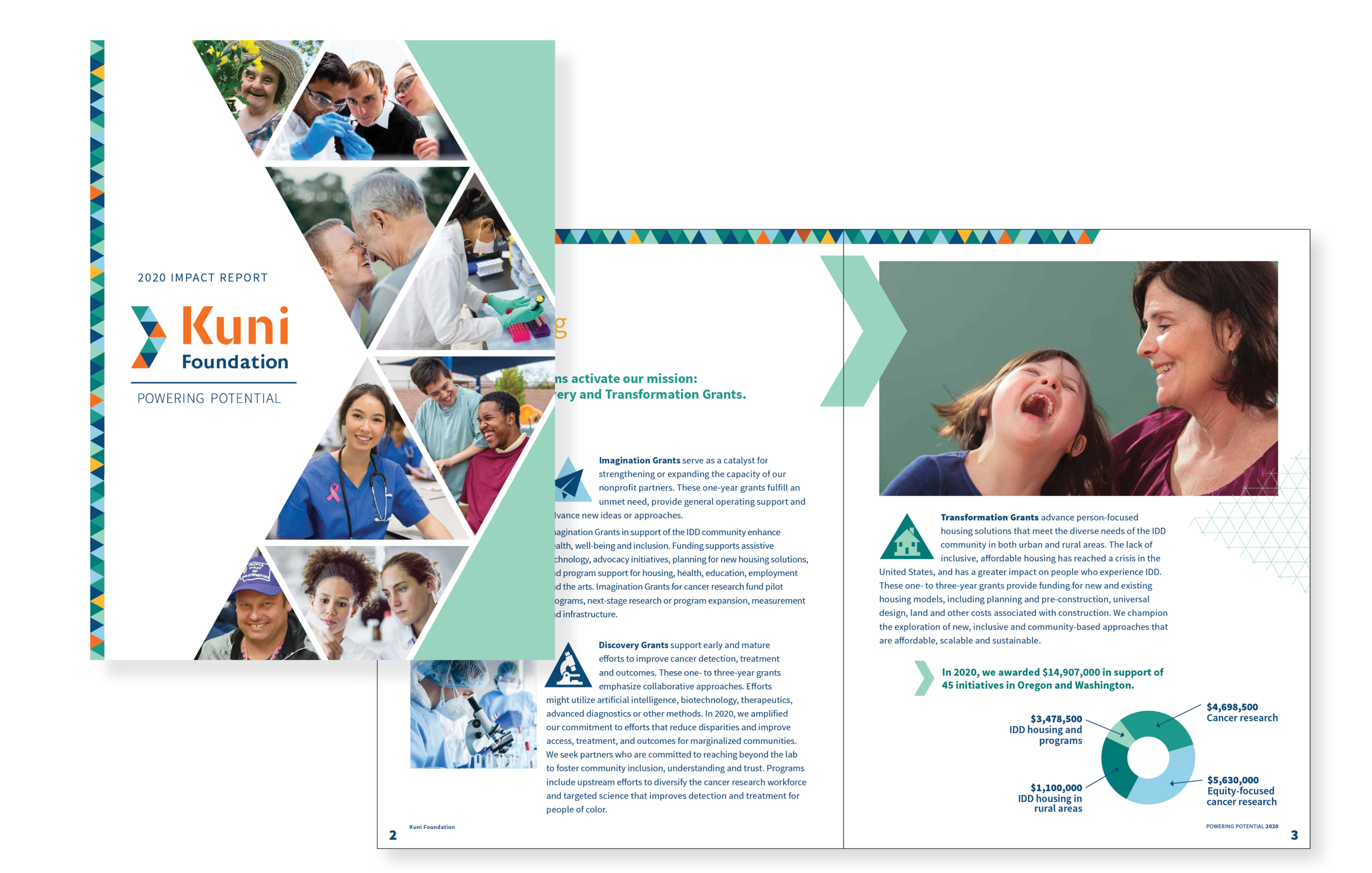 The 20-page impact report that Sheepscot designed represents the foundation’s first foray into magazine-style publishing. Photography and colorful graphics, including a set of original iconography, provide an eye-catching, easy-to-browse framework for data, tables and text.