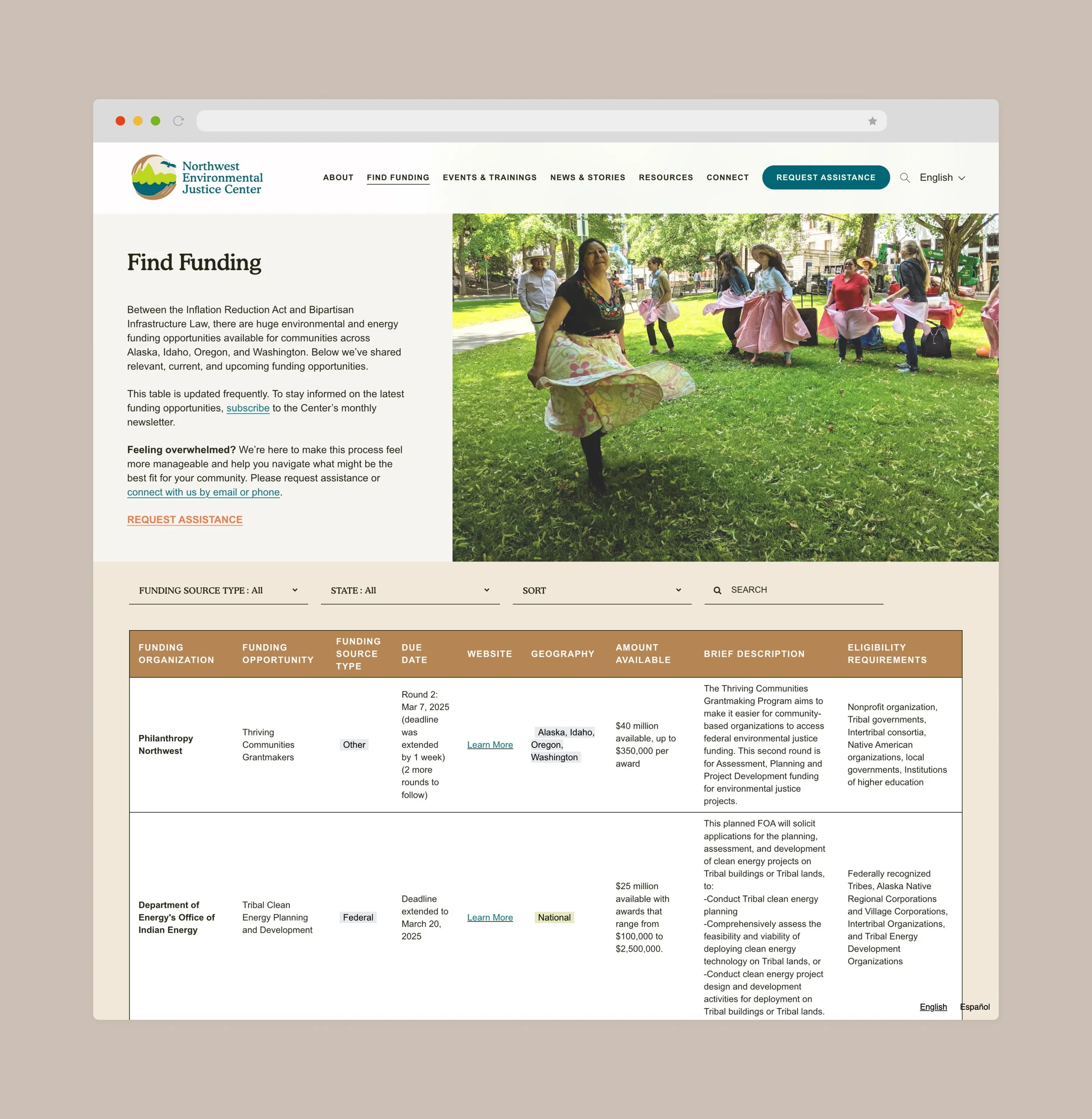 Willamette Partnership’s team wanted an easy to navigate, user-friendly website, with resources readily available for those in need. Below, a screenshot of the “Find Funding” page displays active funding opportunities for environmental justice advocates. The table is populated by a simple Google Sheet file, regularly updated by NWEJC staff and interns. Filters allow users to sort for opportunities according to region, due date, funding available and funding type .